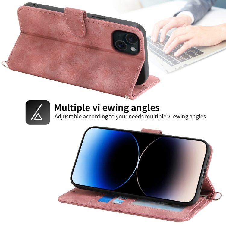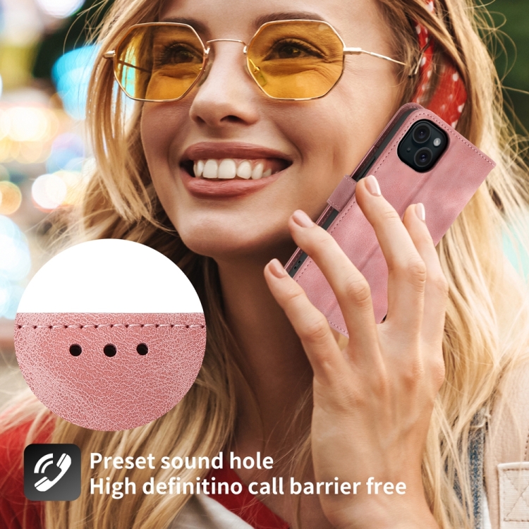 Funda de Cuero para iPhone 15 Plus con Billetera en Relieve y Flores con Sensación de Piel (Rosa)