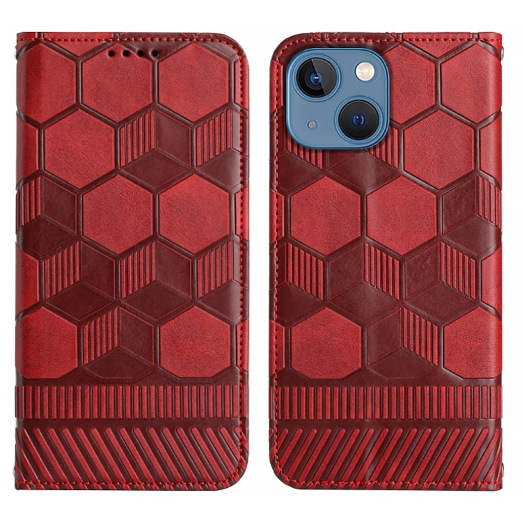 Funda de teléfono para iPhone 15 Plus con tapa de cuero magnético y textura de fútbol (Rojo)