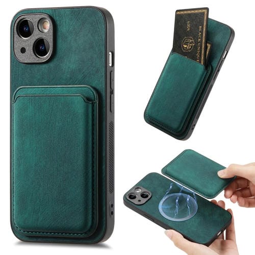 Funda de teléfono para iPhone 15 Plus con bolso de tarjeta magnética de cuero retro (Verde)