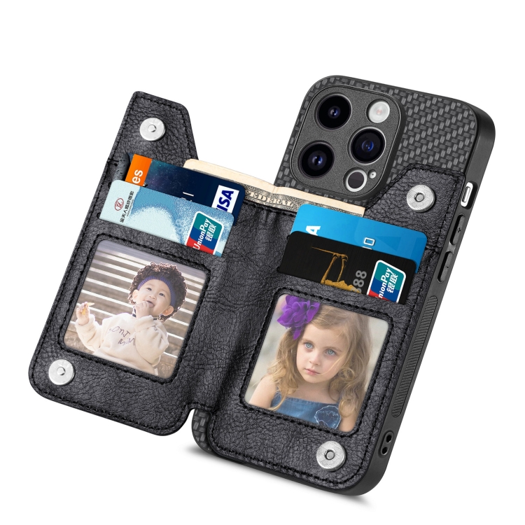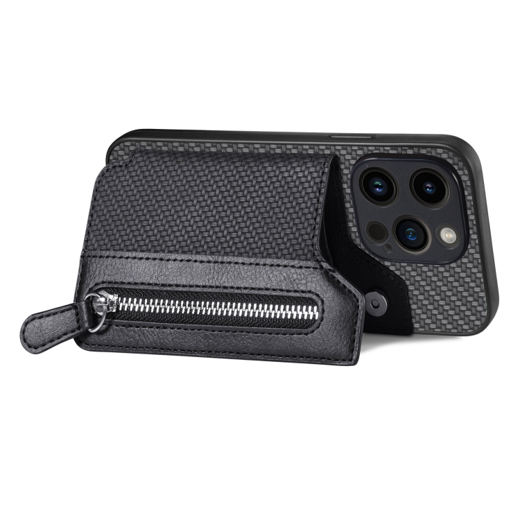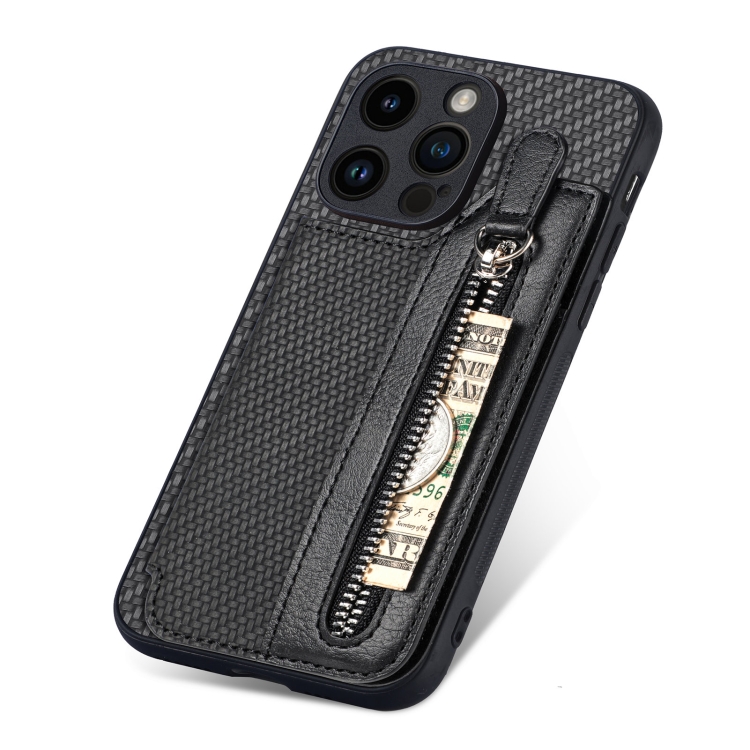 Funda para Teléfono iPhone 15 Plus con Billetera, Cremallera y Tapa Horizontal de Fibra de Carbono (Negro)