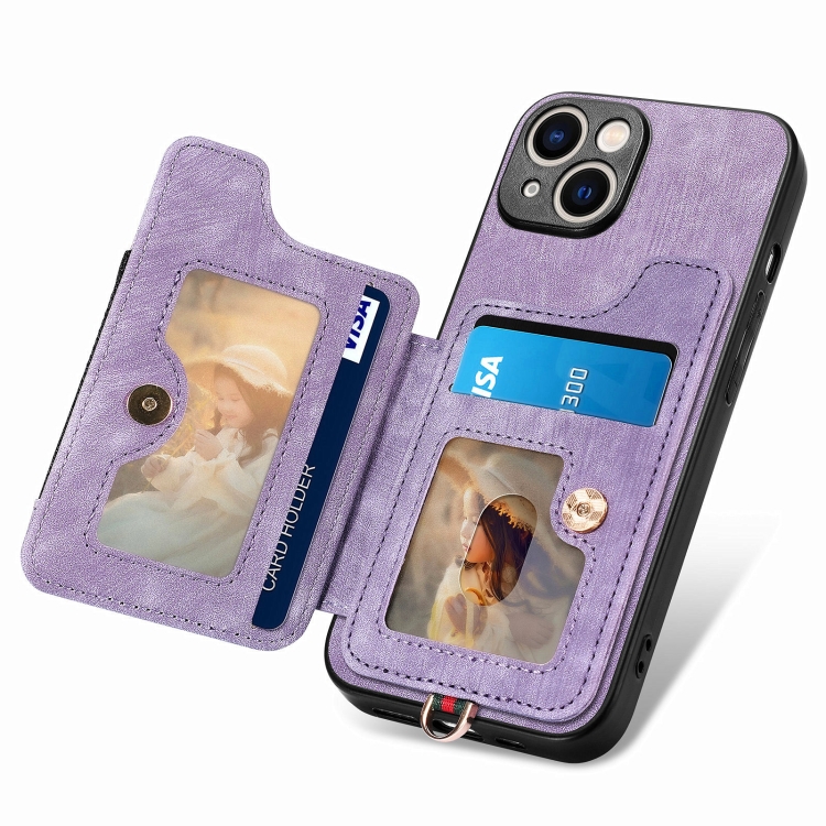 Funda para Teléfono iPhone 15 Plus con Billetera, Anillo Retro y Múltiples Tarjetas (Púrpura)