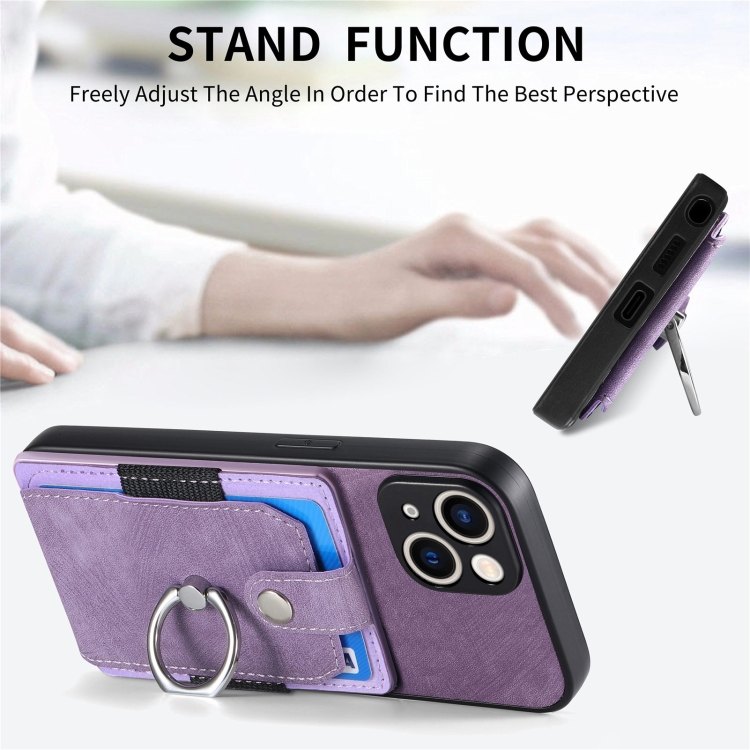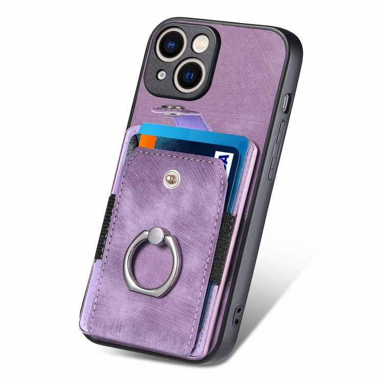 Funda para Teléfono iPhone 15 Plus con Billetera y Tarjeta con Anillo y Sensación de Piel Retro (Púrpura)