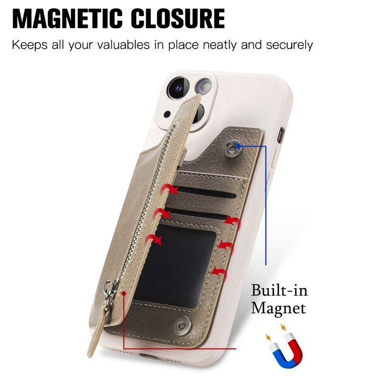 Funda para Teléfono iPhone 15 Plus con Cremallera y Parte Trasera de Cuero a Prueba de Golpes (Caqui)