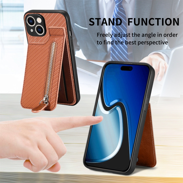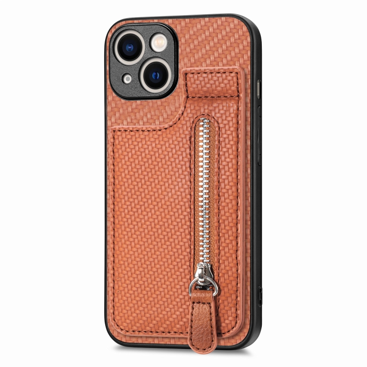 Funda para Teléfono iPhone 15 Plus con Cremallera y Tapa Vertical de Fibra de Carbono (Marrón)