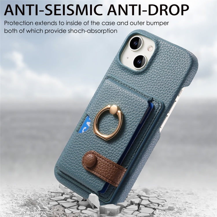 Funda para teléfono iPhone 15 Plus con parte posterior de tarjeta con anillo y borde de aceite de cuero Litchi (Azul Claro)