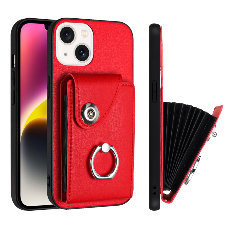 Funda para Teléfono iPhone 15 Plus con Soporte para Anillo y Bolsa para Tarjeta de Órgano (Rojo)