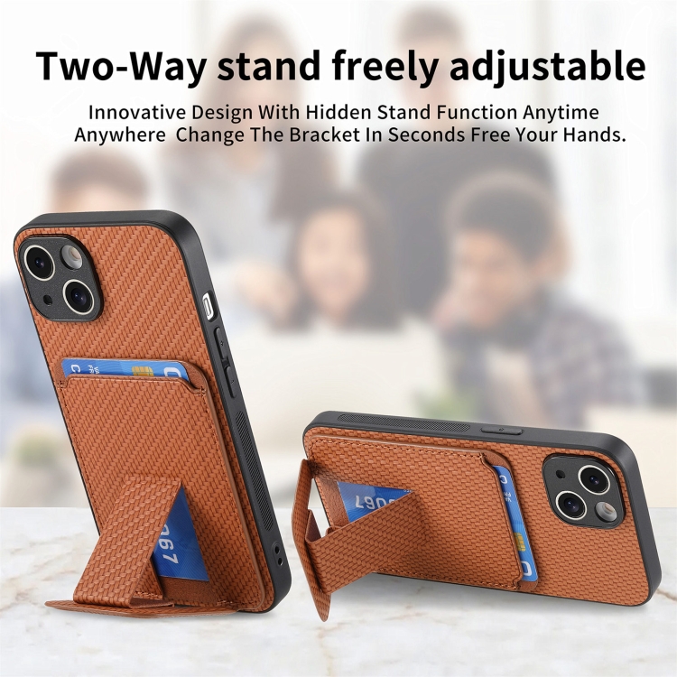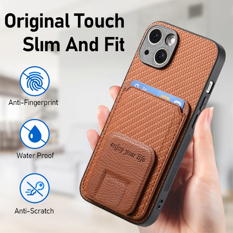 Funda para Teléfono iPhone 15 Plus con Soporte Plegable y Bolsa para Tarjetas Fibra de Carbono (Marrón)