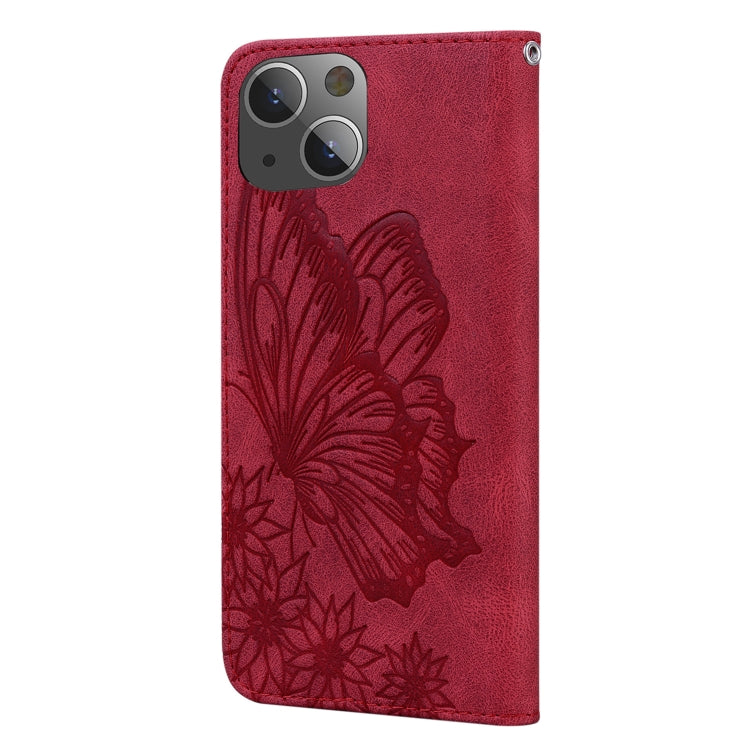 For iPhone 15 Plus Retro Leather Feel Butterfly Pattern Phone Case (Red)