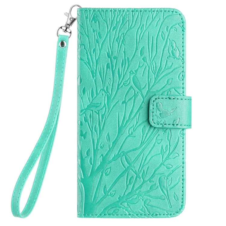 Funda para Teléfono iPhone 15 Plus Cuero Patrón En Relieve Pájaros y Árboles (Verde)