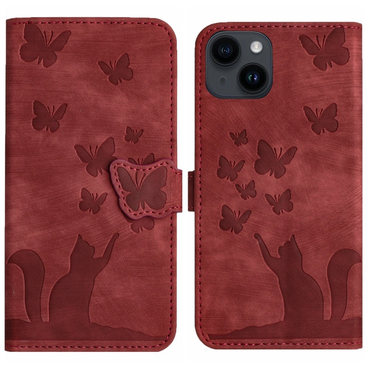 Funda para teléfono iPhone 15 Plus Cuero con Tapa Estampado de Gato Mariposa (Rojo)