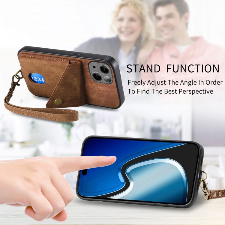 Funda para Teléfono iPhone 15 Plus Cuero Plegable con Billetera y Tarjeta Retro con Correa (Marrón)