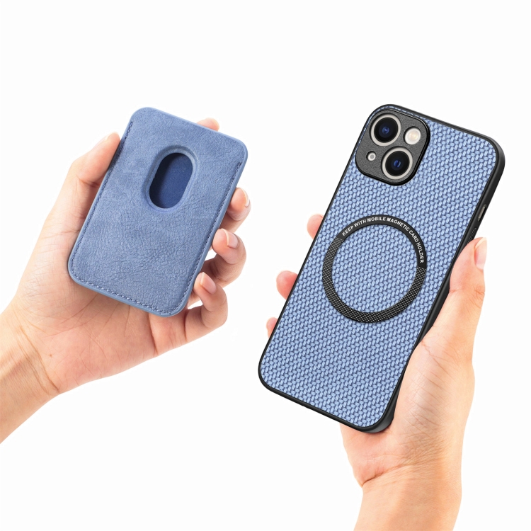 Funda para Teléfono iPhone 15 Plus Magsafe con Tarjeta Cuero Fibra de Carbono (Azul)