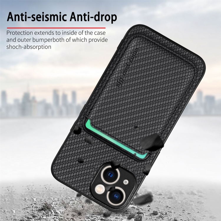 Funda para Teléfono iPhone 15 Plus Magsafe con Tarjeta Cuero Fibra de Carbono (Negro)