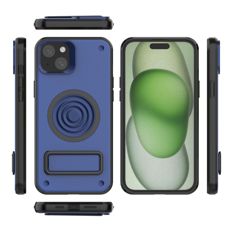 Funda para Teléfono iPhone 15 Plus PC + TPU con Textura de Fibra de Carbono y Soporte de Metal (Azul)