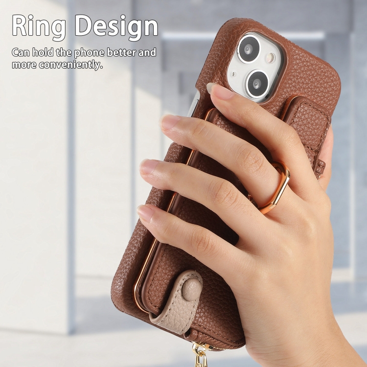 Funda Trasera para iPhone 15 Plus con Billetera, Cremallera y Anillo de Cuero Litchi (Marrón)
