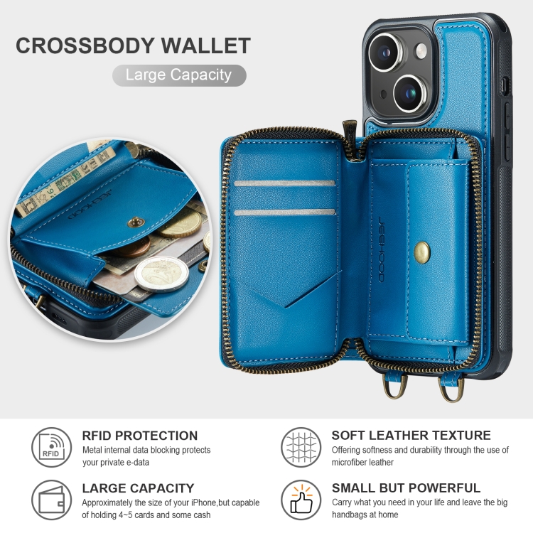 Funda para iPhone 15 Plus Jeehood C22 Series Cuero con Billetera Cremallera y Cordón Doble (Azul)