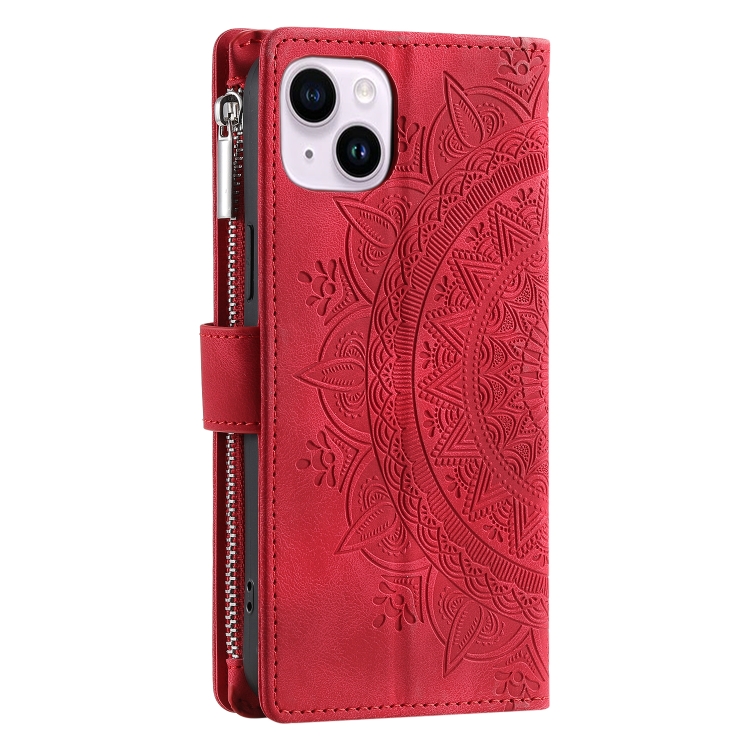 Funda para iPhone 15 Plus Multi-Card Totem de Cuero con Cremallera (Rojo)