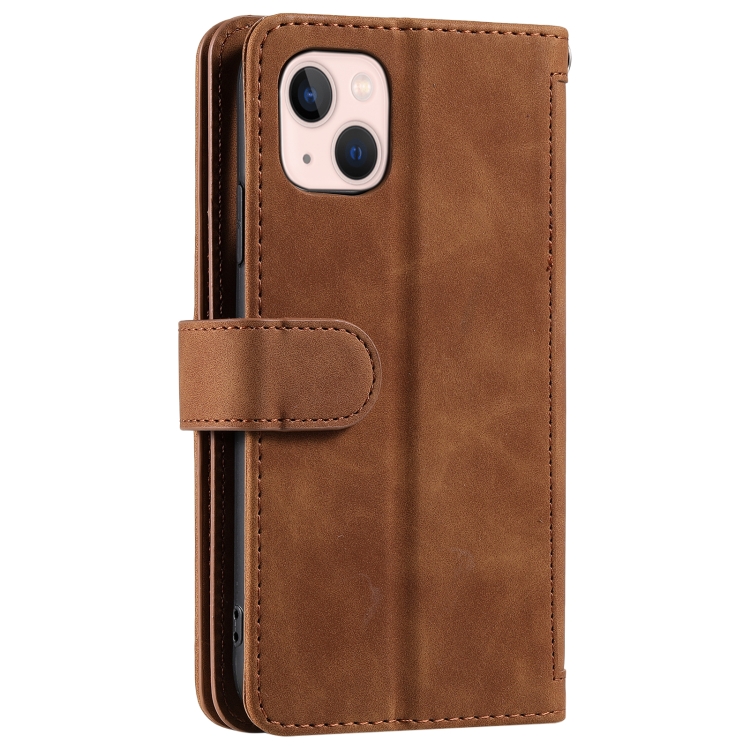 Funda de Cuero Nine Card Zipper Bag para iPhone 15 Plus con Cordón (Marrón)