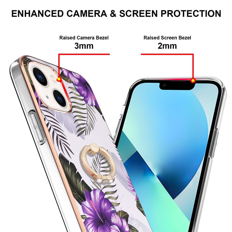 Estuche TPU para iPhone 15 Plus Patrón Galvanoplastia Imd a Prueba de Golpes con Soporte para Anillo (Flor Púrpura)