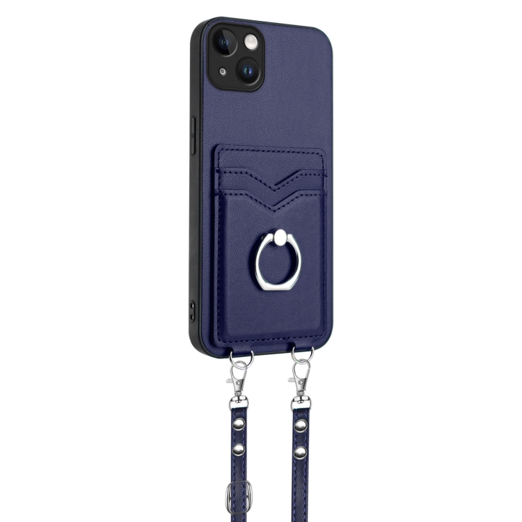 Funda para Teléfono iPhone 15 Plus R20 con Soporte para Tarjeta y Anillo de Cuerda Cruzada (Azul)