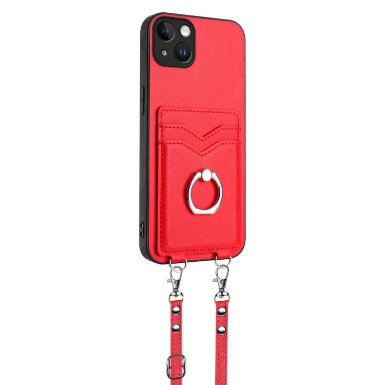 Funda para Teléfono iPhone 15 Plus R20 con Soporte para Tarjeta y Anillo de Cuerda Cruzada (Rojo)
