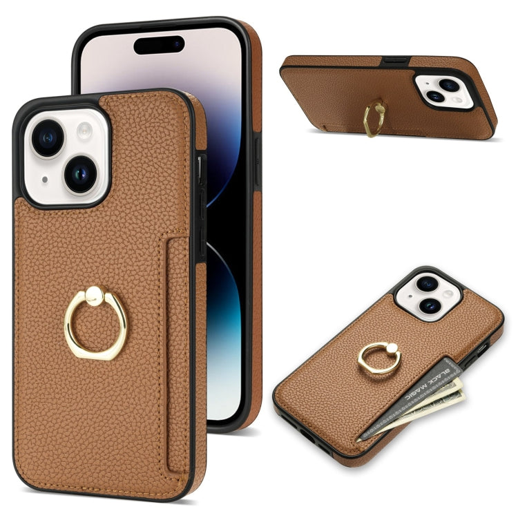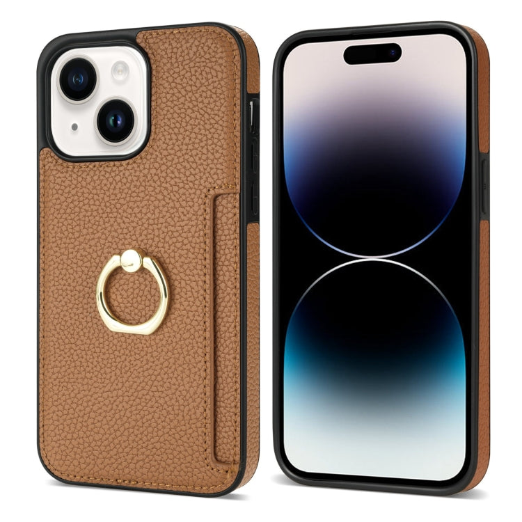 For iPhone 15 Plus Ring Card Litchi Leather Phone Back Case (Brown)