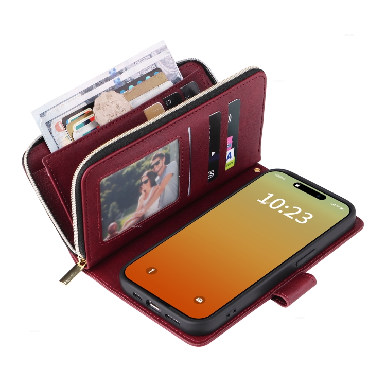 Funda de Cuero para iPhone 15 Pro Bolso Tipo Billetera con Cremallera y 9 Ranuras para Tarjetas (Rojo Vino)