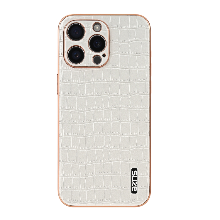 Estuche para teléfono Azns iPhone 15 Pro Textura de Cocodrilo y Marco Galvanizado (Blanco)