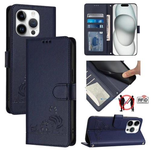 Estuche para Teléfono iPhone 15 Pro Cat Rat Cuero Rfid Patrón en Relieve con Cordón (Azul)