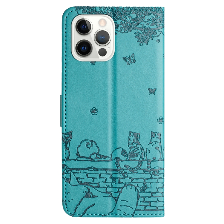 Funda de Cuero para iPhone 15 Pro Cat Relieve Patrón con Cordón (Azul)
