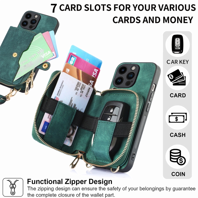 Funda para teléfono iPhone 15 Pro Crossbody con billetera con cremallera multifunción (Verde)