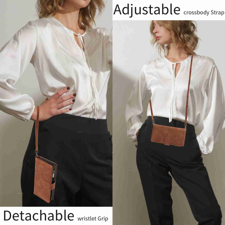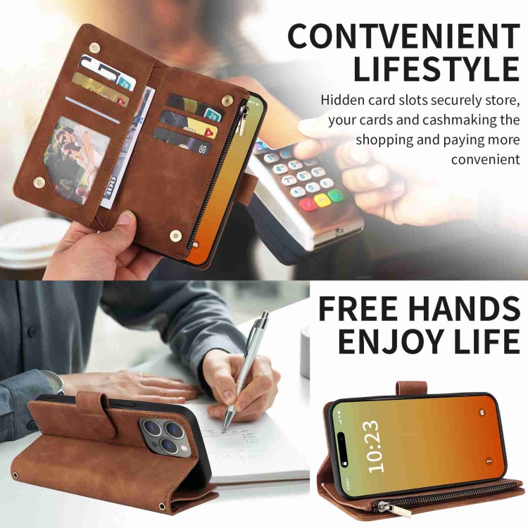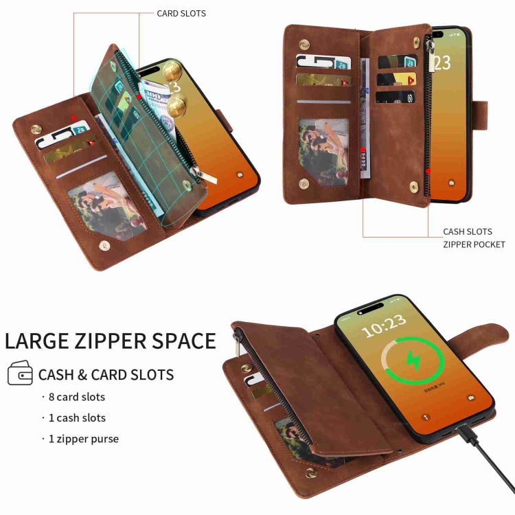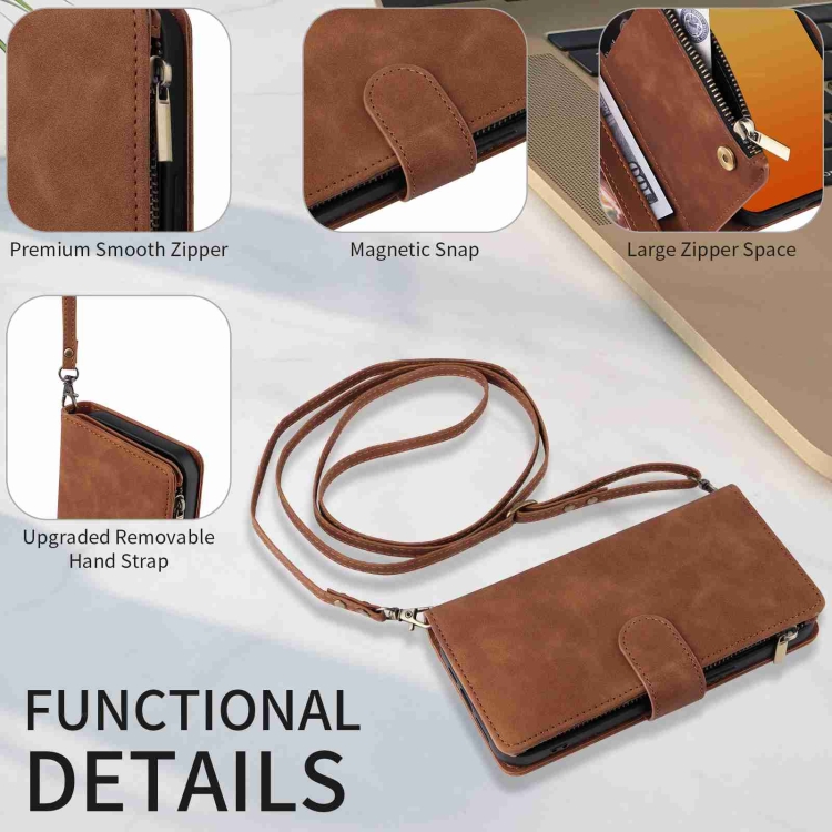 Funda para Teléfono iPhone 15 Pro Crossbody de Cuero con Cremallera y Ranura para Tarjetas (Marrón)