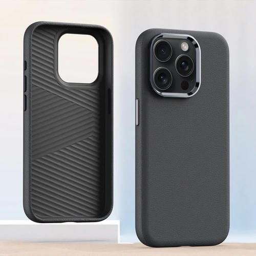 Estuche para Teléfono iPhone 15 Pro a Prueba de Golpes Cuero con Marco de Lente de Metal (Gris)