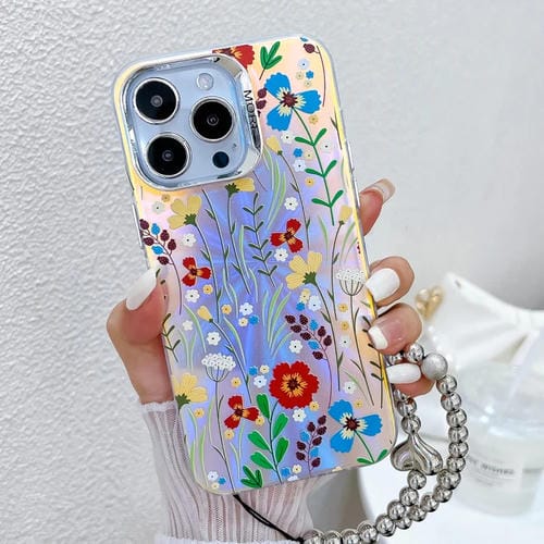 Estuche para teléfono iPhone 15 Pro con Flor Láser Galvanizada y Correa para la Muñeca (Flor Ah6)