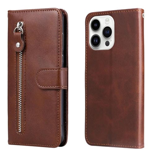 Funda para teléfono iPhone 15 Pro Fashion Becerro Textura Cremallera de Cuero (Marrón)