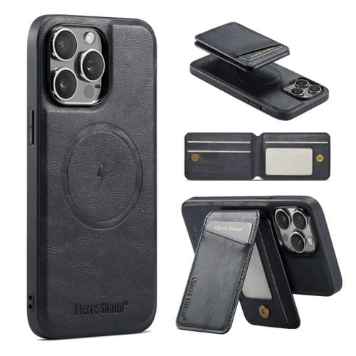 For iPhone 15 Pro Fierre Shann Oil Wax Cowhide Leather Magnetic Card Holder Phone Case (Black)