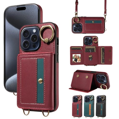 Funda de Cuero para iPhone 15 Pro con Soporte para Anillo y Bolso Cruzado para Tarjeta (Rojo)