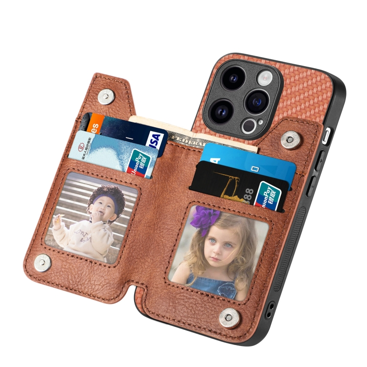 Funda para Teléfono iPhone 15 Pro con Billetera, Cremallera y Tapa Horizontal de Fibra de Carbono (Marrón)