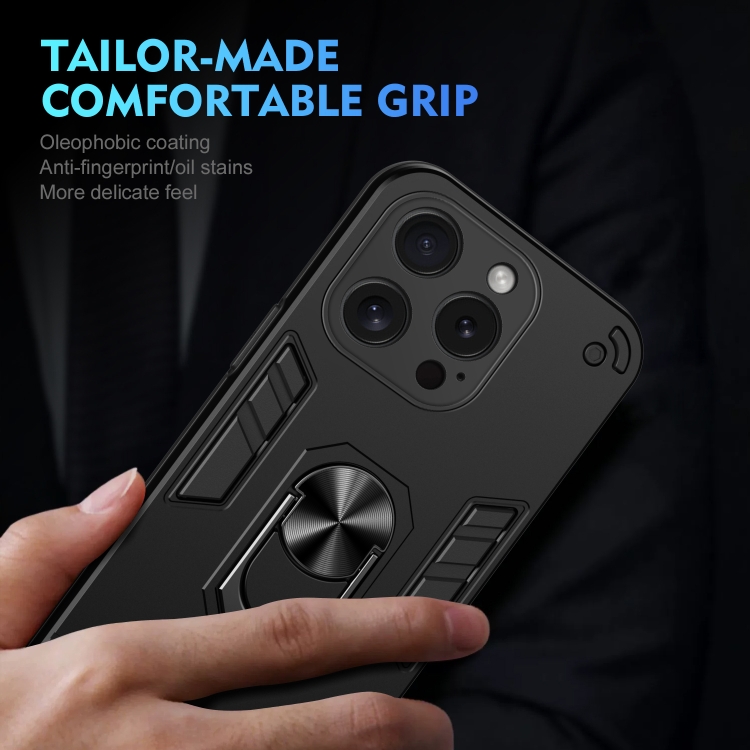 For iPhone 15 Pro Phone Case with Metal Ring Holder Shockproof (Black)