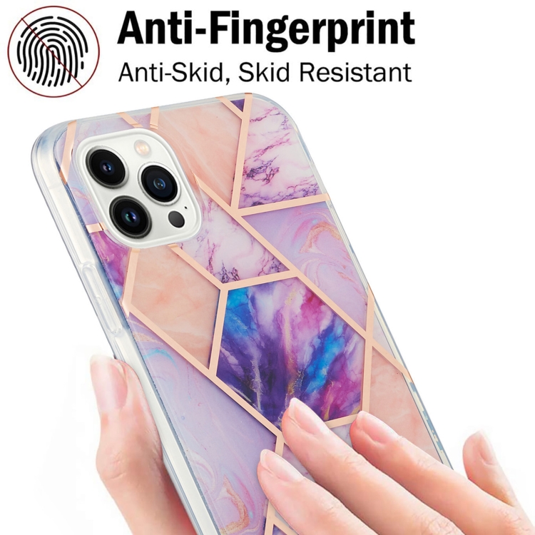 Funda para iPhone 15 Pro Galvanoplastia Empalme Mármol Patrón Flores Doble Cara Imd TPU a Prueba de Golpes (Púrpura Claro)