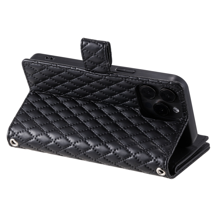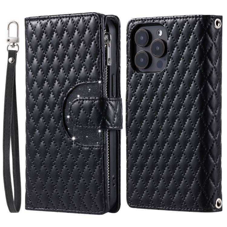 Funda para Teléfono iPhone 15 Pro Glitter Lattice Zipper Wallet Cuero (Negro)