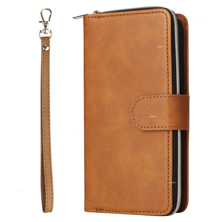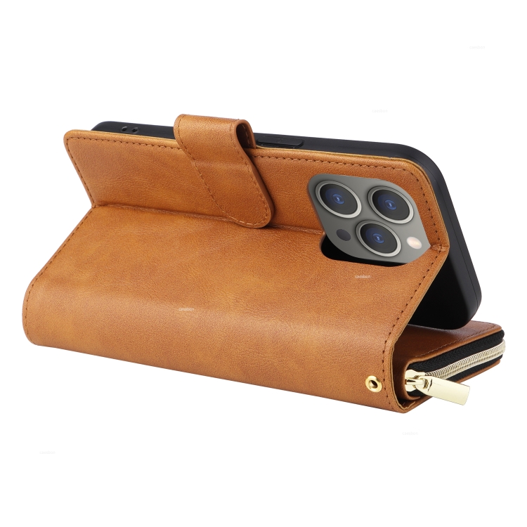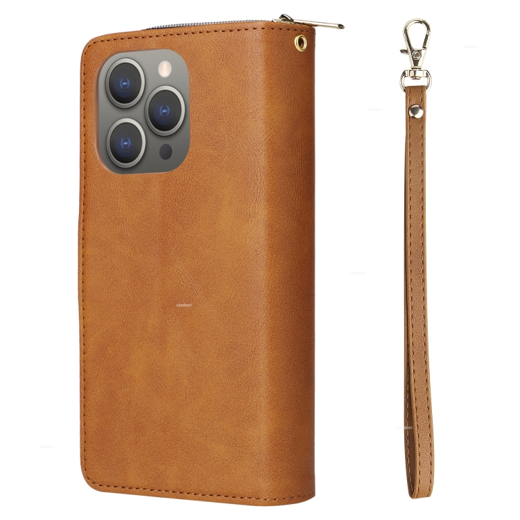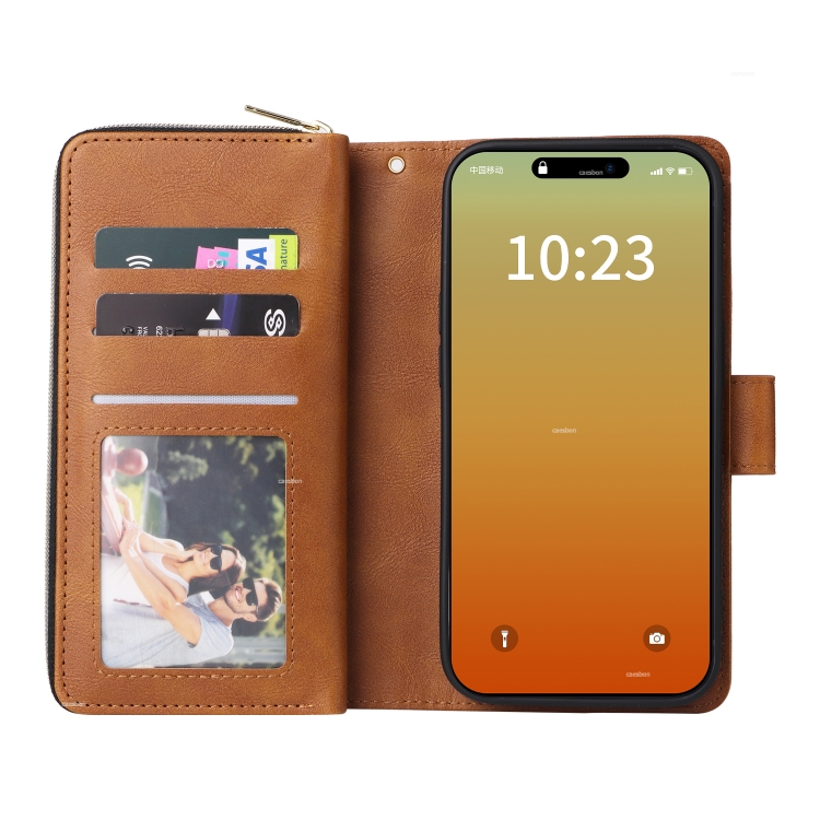 Funda para Teléfono iPhone 15 Pro Max Bolso Tipo Billetera 9 Ranuras para Tarjetas Cremallera (Marrón)