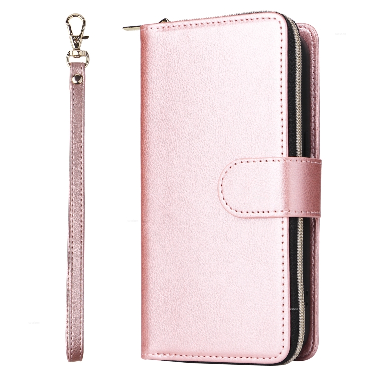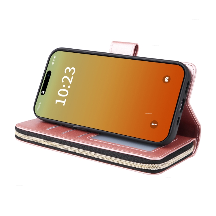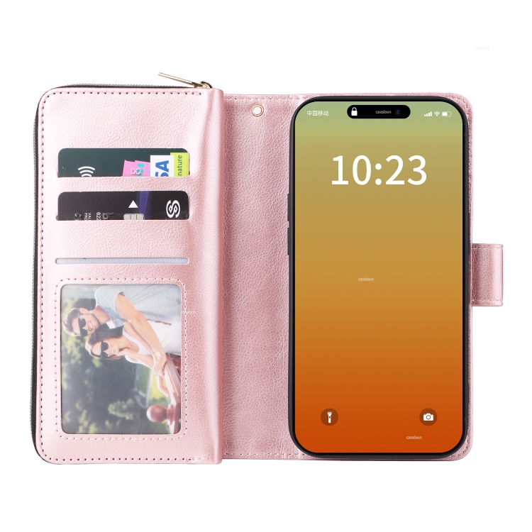 Funda para iPhone 15 Pro Max Bolso Billetera con Cremallera 9 Ranuras para Tarjetas (Oro Rosa)