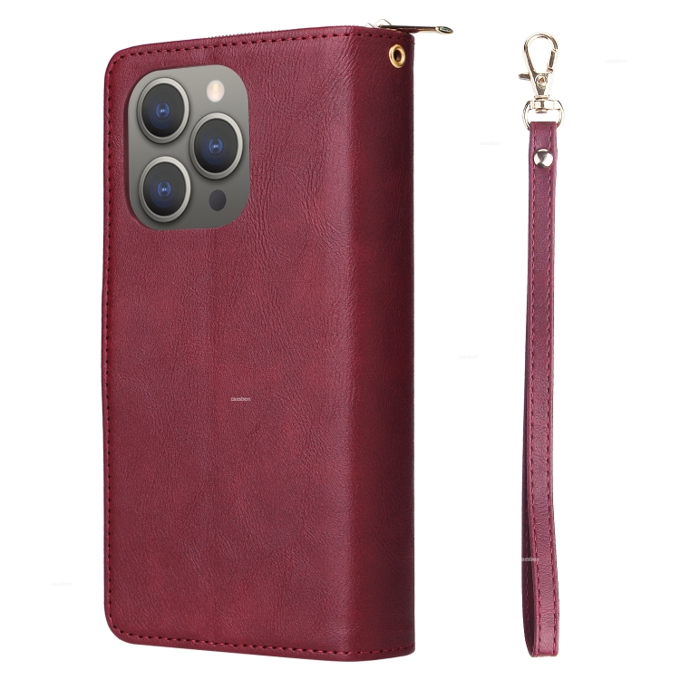 Funda para iPhone 15 Pro Max Cartera con Cremallera 9 Ranuras para Tarjetas (Rojo Vino)