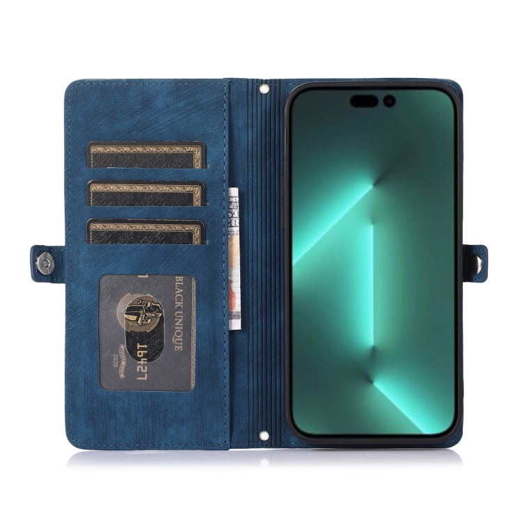 Funda para Teléfono iPhone 15 Pro Max Cremallera Ranura para Tarjeta Hebilla Monedero Cuero (Azul)