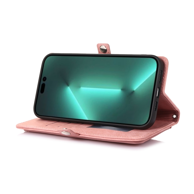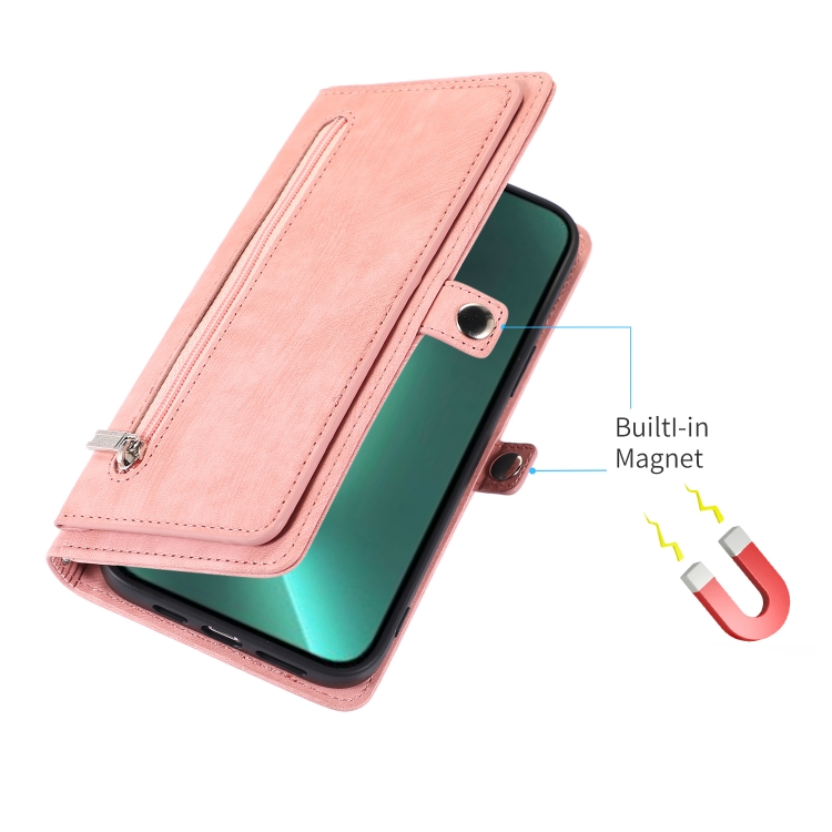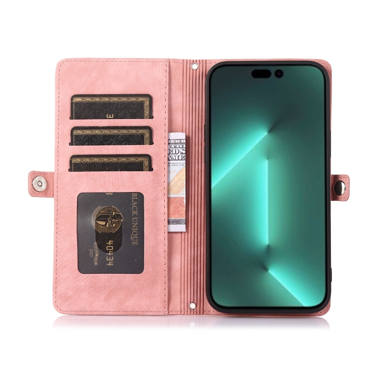Funda de Cuero para iPhone 15 Pro Max con Cremallera Ranura para Tarjeta Hebilla Monedero (Rosa)