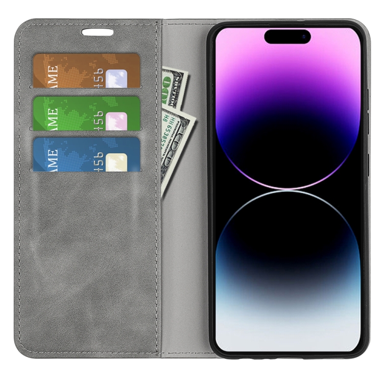 Funda de Teléfono iPhone 15 Pro Max Cuero Succión Magnética Piel Retro (Gris)