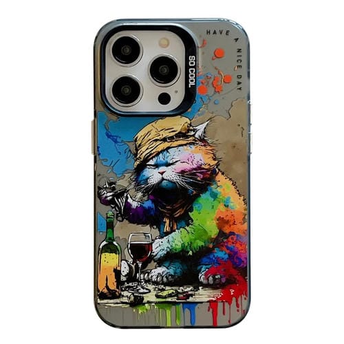 Funda para Teléfono iPhone 15 Pro Max Patrón Animal Serie Pintura al Óleo PC TPU (Gato Bebiendo)
