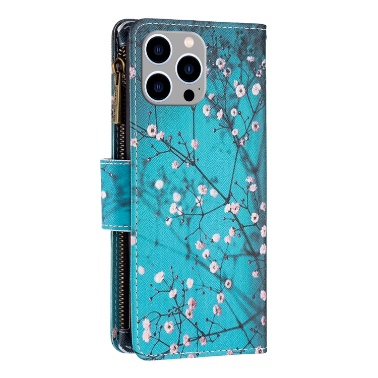 Funda de Cuero para iPhone 15 Pro Max Patrón de Dibujo Coloreado con Cremallera (Flor de Ciruelo)