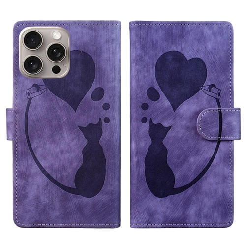 Funda de Cuero para iPhone 15 Pro Pen Heart Cat En Relieve (Púrpura)